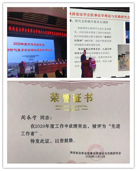 11月14日,陕西省法学会医事法学理论与实践研究会召开2020年度总结会暨新时代医疗纠纷调处及预防研讨会,我所主任闫永宁被评为“先进工作者”受到表彰。